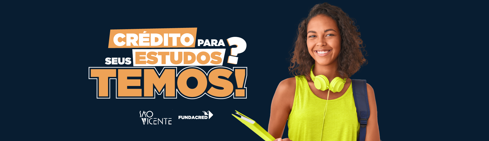 Esse é o crédito educacional oferecido pela parceria entre a São Vicente Educacional e a Fundacred que amplia as possibilidades para a sua formação profissional. Com o CredIES, o aluno São Vicente paga apenas metade da mensalidade durante o curso e a outra metade só após a conclusão do curso.