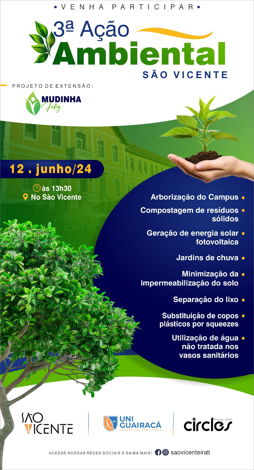 A todas essas ações contínuas será somada uma ação pontual: a 3ª Ação Ambiental São Vicente, que ocorrerá no dia 12 de junho, a partir das 13h30. Esta ocasião representará um momento específico de conscientização e reforço das práticas permanentes de proetação ambiental. Através do plantio de mudas, que tem valor simbólico mas também tem o potencial de estimular a arborização da cidade, serão fomentadas todas as ações que precisam ser adotadas no cotidiano.